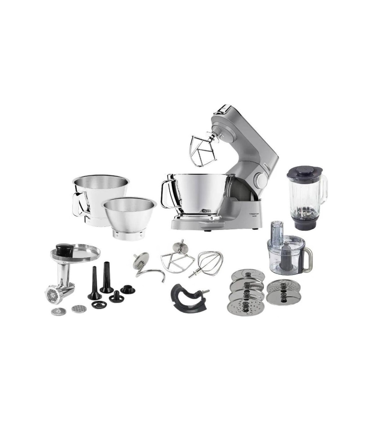- Roostevaba käepidemetegaanuma maht 5l, kaanega 3,5l roostevabaterastest kauss,4 otsikut (K- otsik, vispel, taignakonks, segamislaba) viilutamiseks ja riivimiseks 6 riivketast+1 purustusnuga,Thermo Resist blender (1,6 l) klaasakann, hakklihamasin (3 teraga