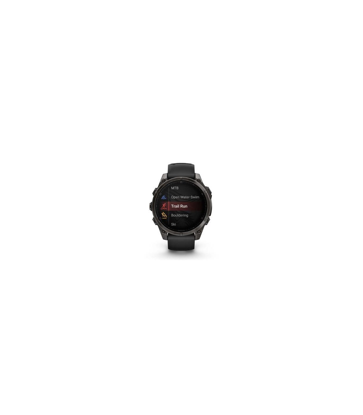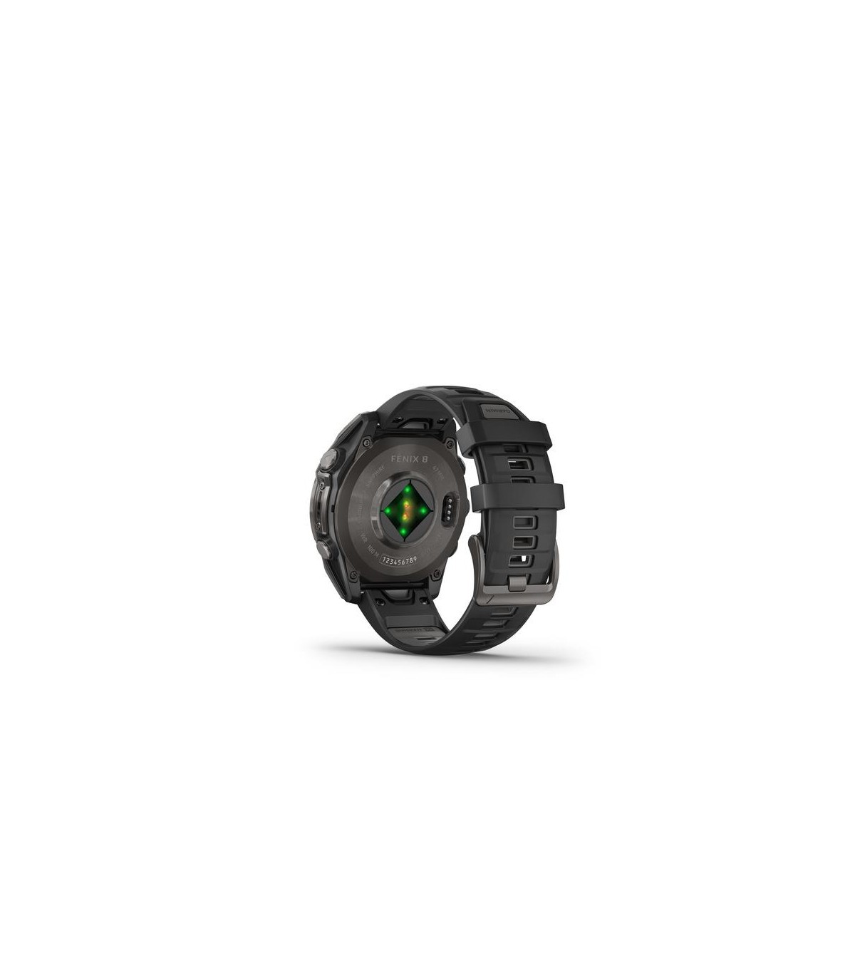 - Garmin fenix 8. Display diagonal: 3.56 cm (1.4"), Display technology: AMOLED, Display resolution: 454 x 454 pixels, Touchscreen. Flash memory: 32 GB. Wi-Fi. GPS (satellite). Waterproof up to: 40 m, Band material: Silicone, Band colour: Black, Band size: O