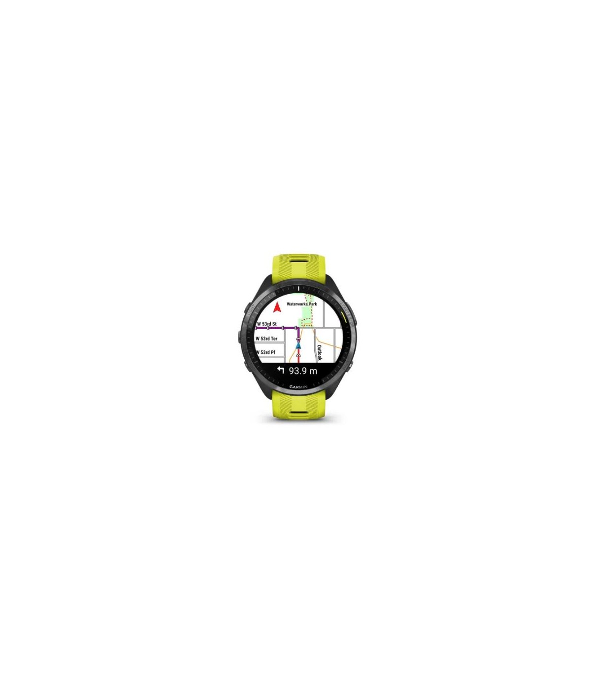 - Garmin Forerunner 965. Display diagonal: 3.56 cm (1.4"), Display technology: AMOLED, Display resolution: 454 x 454 pixels, Touchscreen. Flash memory: 32 GB. Wi-Fi. GPS (satellite). Weight: 53 g. Band material: Silicone, Band colour: Yellow, Band size: One