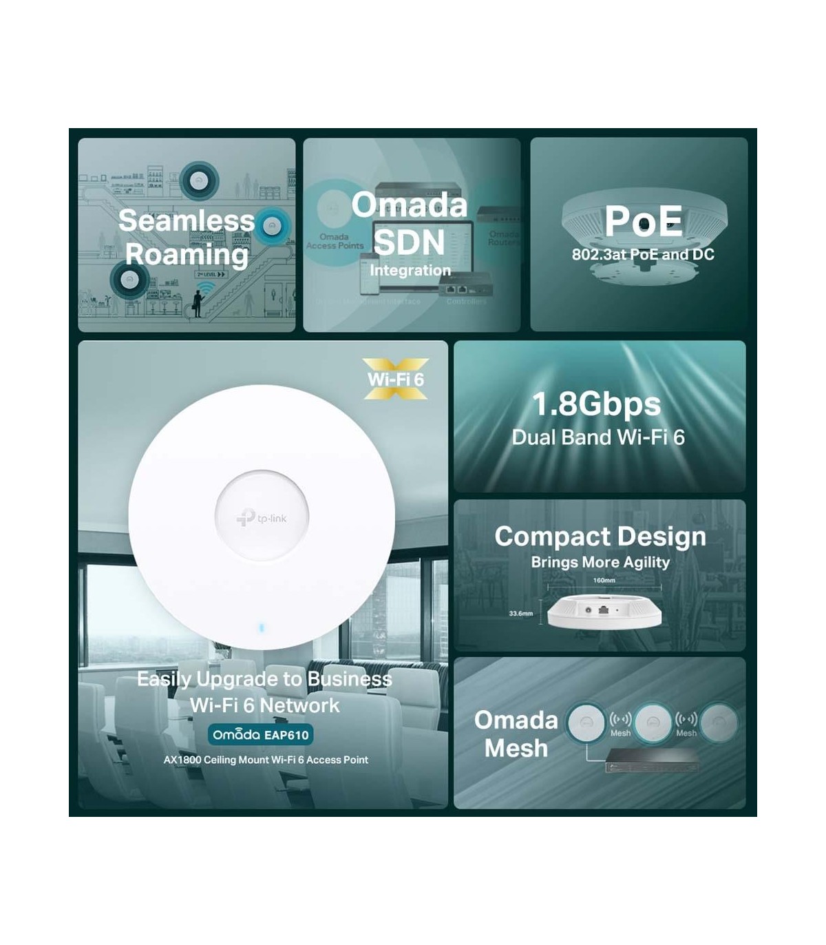 - TP-Link Omada AX1800 Wireless Dual Band Ceiling Mount Access Point. 2.4 GHz, 5 GHz, Maximum data transfer rate: 1775 Mbit/s. Security algorithms: WPA, WPA-Enterprise, WPA2, WPA2-Enterprise, WPA3, WPA3-Enterprise. Ethernet LAN data rates: 10,100,1000 Mbit/