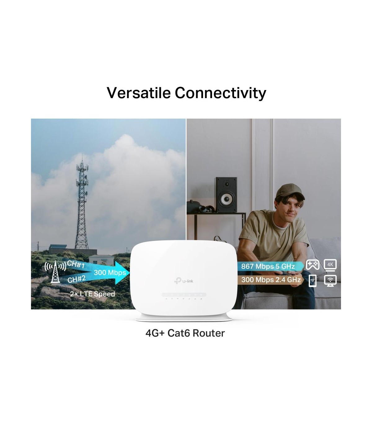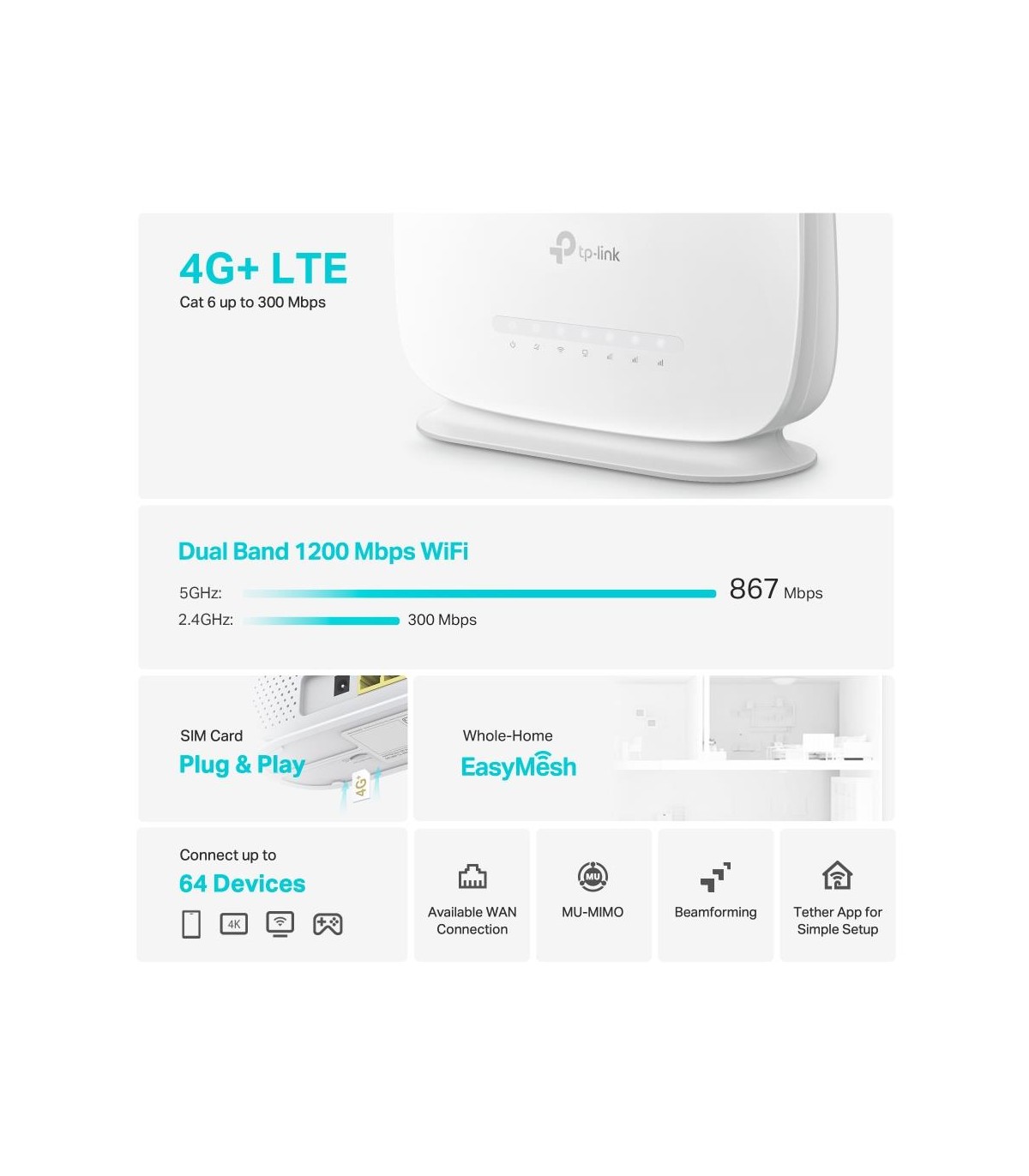 - TP-Link Archer 4G+ Cat6 AC1200 Wireless Dual Band Gigabit Router. Wi-Fi band: Dual-band (2.4 GHz / 5 GHz), Top Wi-Fi standard: Wi-Fi 5 (802.11ac), WLAN data transfer rate (max): 1200 Mbit/s. Ethernet LAN interface type: Gigabit Ethernet, Ethernet LAN data