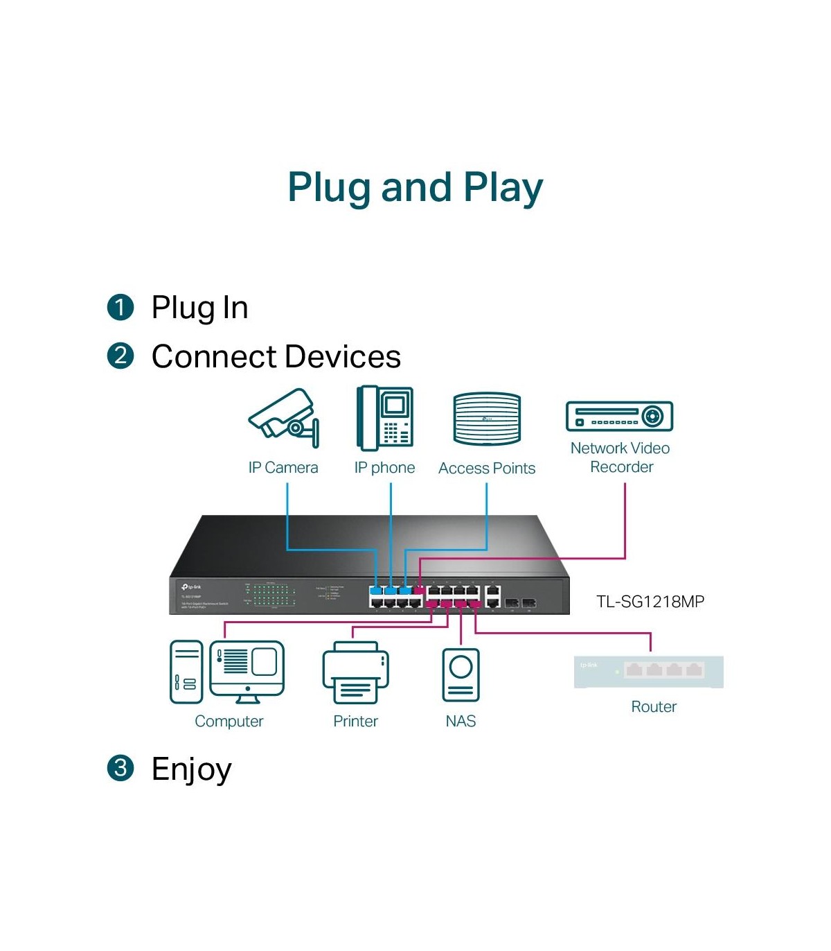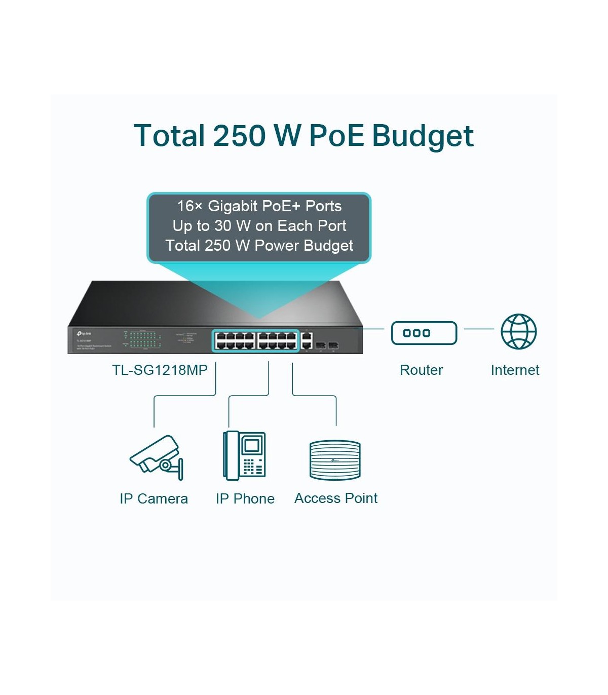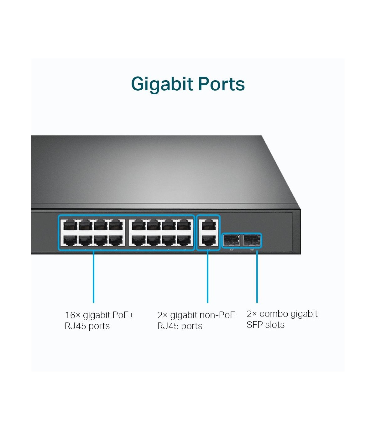 - TP-Link 18-Port Gigabit Rackmount Switch with 16 PoE+. Switch type: Unmanaged. Basic switching RJ-45 Ethernet ports type: Gigabit Ethernet (10/100/1000), Basic switching RJ-45 Ethernet ports quantity: 18. Full duplex. MAC address table: 8000 entries, Swit
