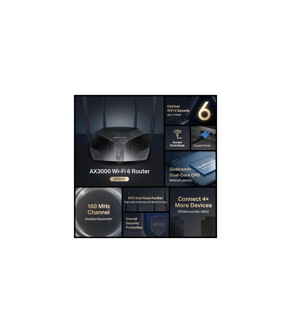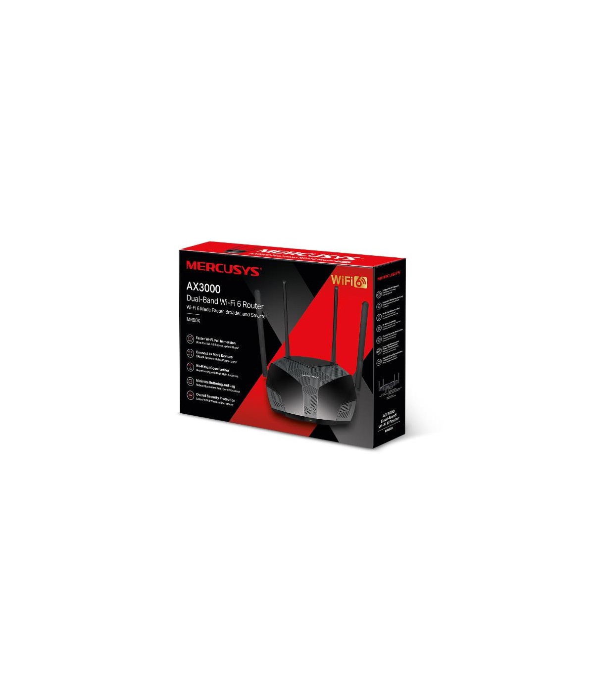 - Mercusys AX3000 Dual-Band Wi-Fi 6 Router. WAN connection type: RJ-45. Wi-Fi band: Dual-band (2.4 GHz / 5 GHz), Top Wi-Fi standard: Wi-Fi 6 (802.11ax), WLAN data transfer rate (max): 3000 Mbit/s. Ethernet LAN interface type: Gigabit Ethernet, Ethernet LAN