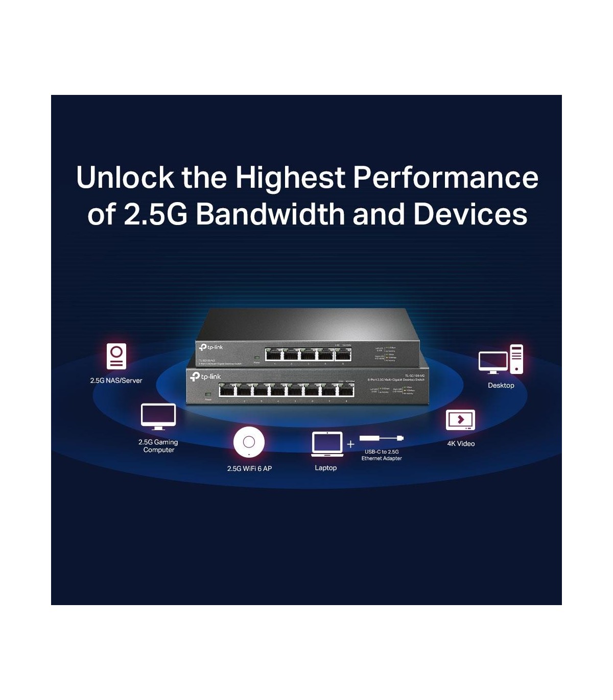 - TP-Link 5-Port 2.5G Desktop Switch. Switch type: Unmanaged. Basic switching RJ-45 Ethernet ports type: 2.5G Ethernet (100/1000/2500), Basic switching RJ-45 Ethernet ports quantity: 5. MAC address table: 16000 entries, Switching capacity: 25 Gbit/s. Networ