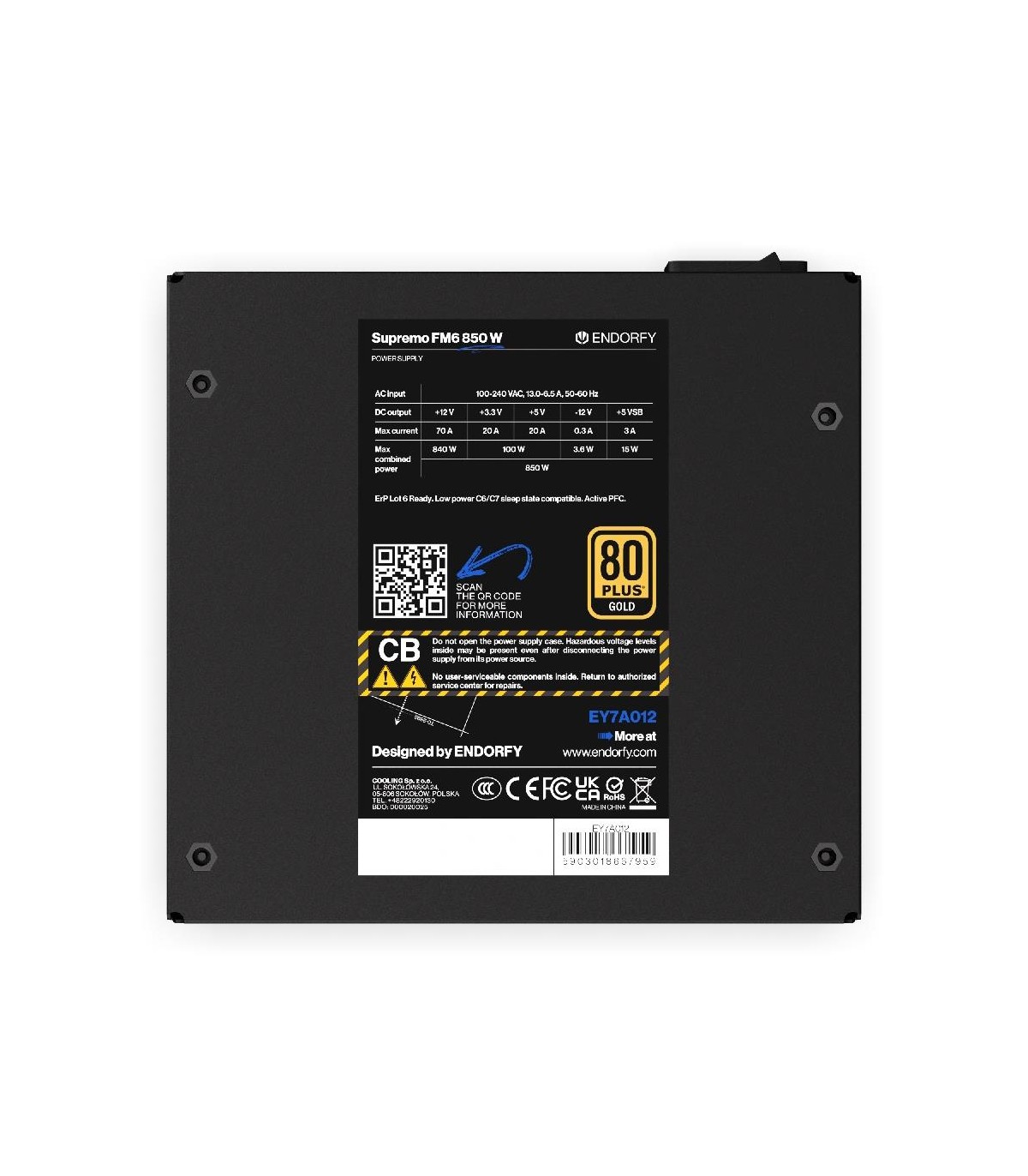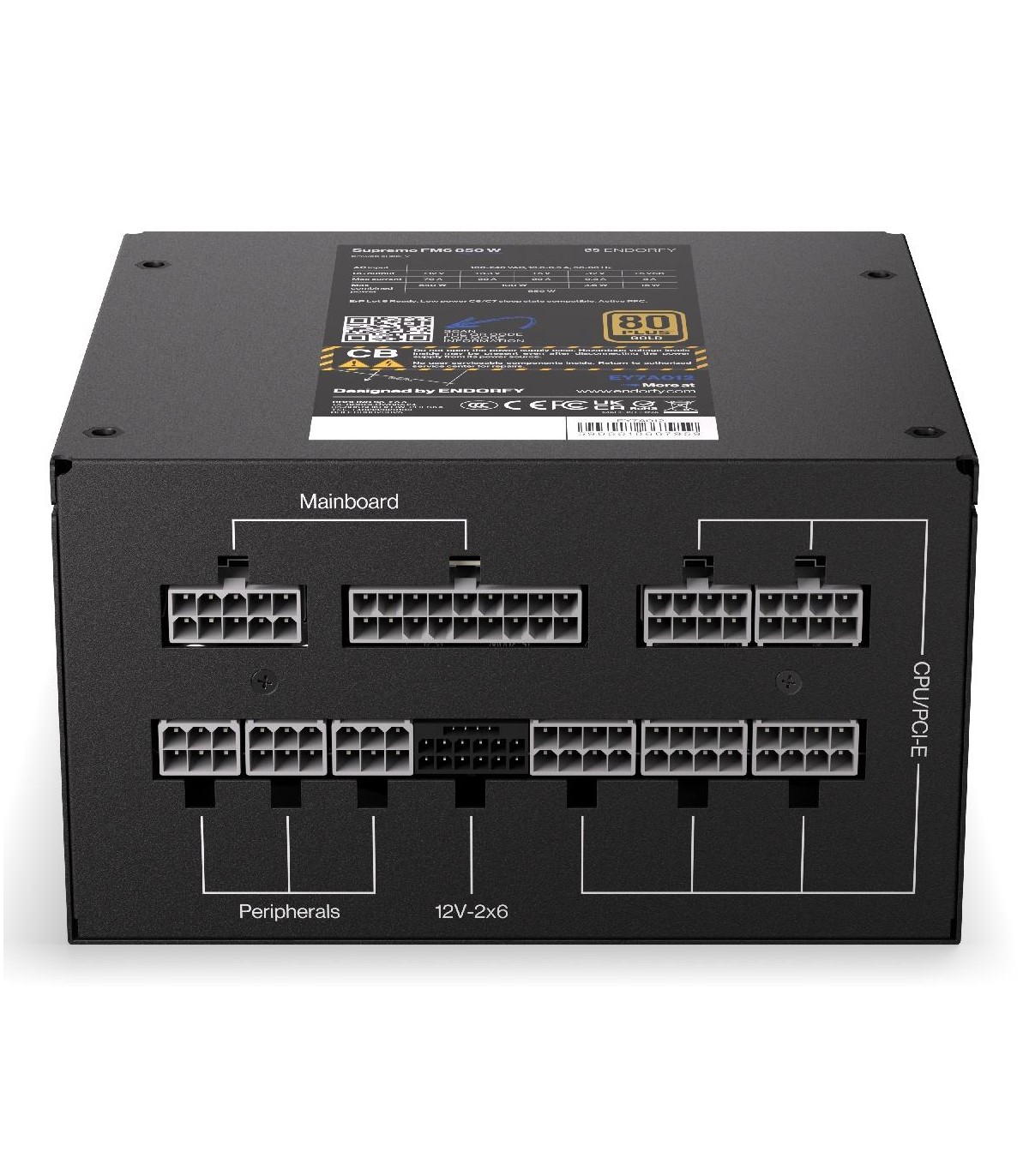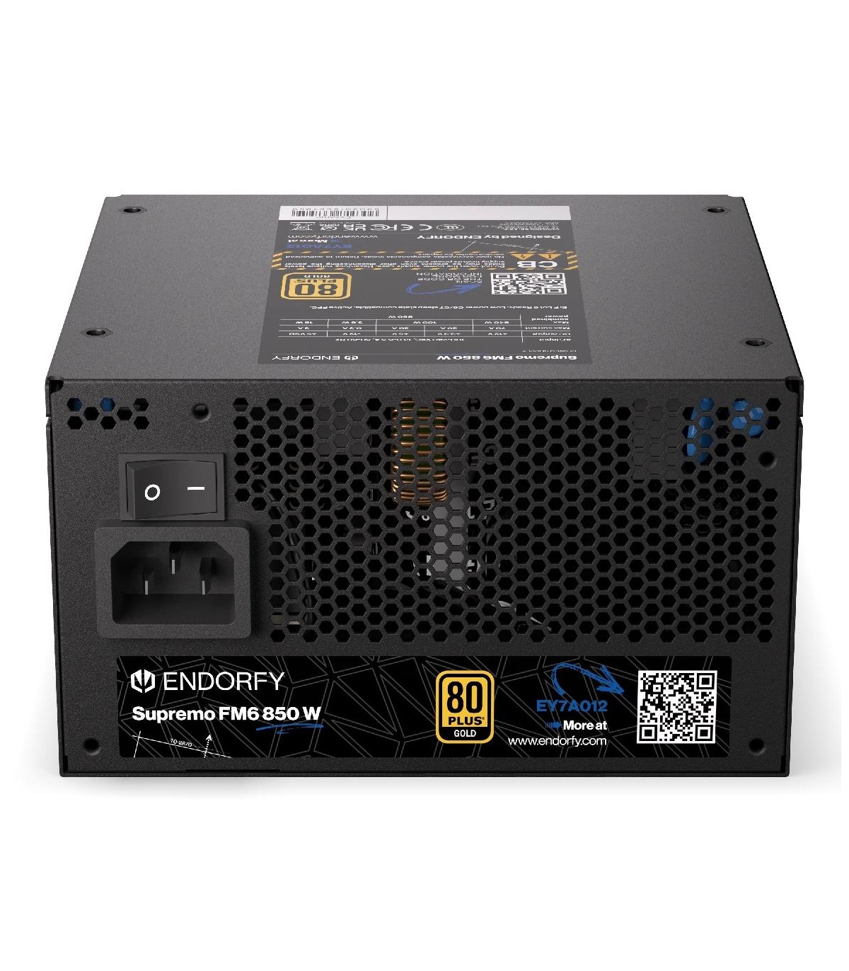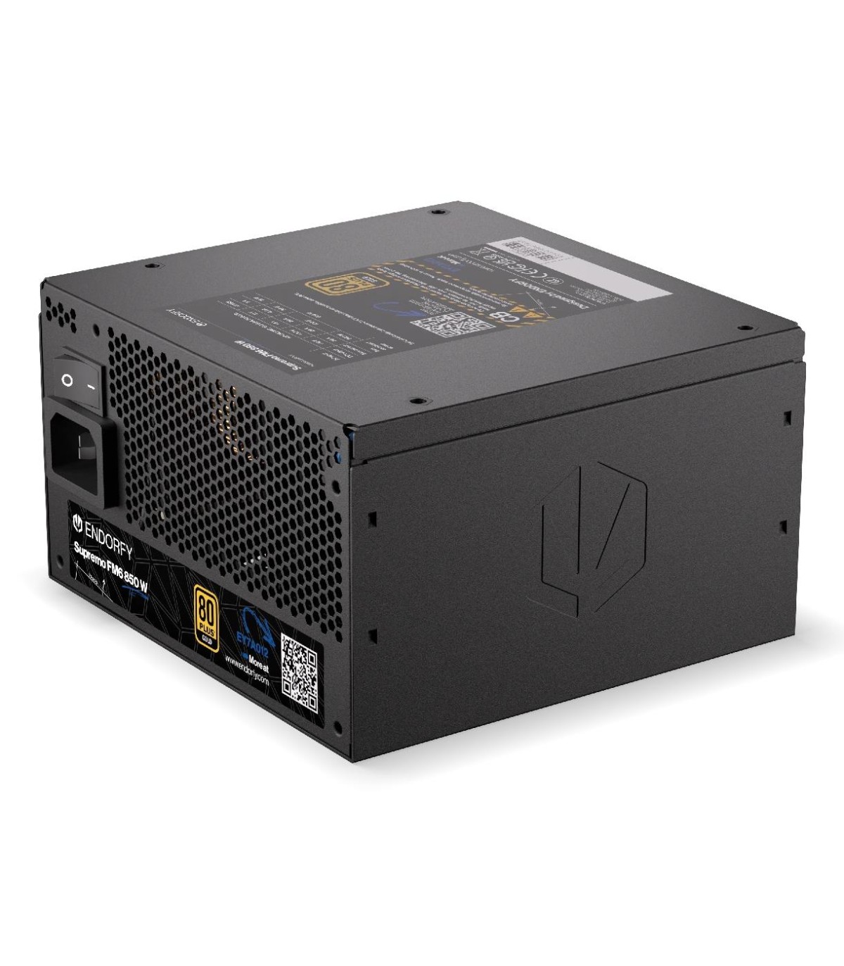 - ENDORFY Supremo FM6 850 W. Total power: 850 W, AC input voltage: 100 - 240 V, AC input frequency: 50/60 Hz. Motherboard power connector: 24-pin ATX, SATA power cable length: 560 mm, Cabling type: Fully-Modular. Purpose: PC, Power supply unit (PSU) form fa