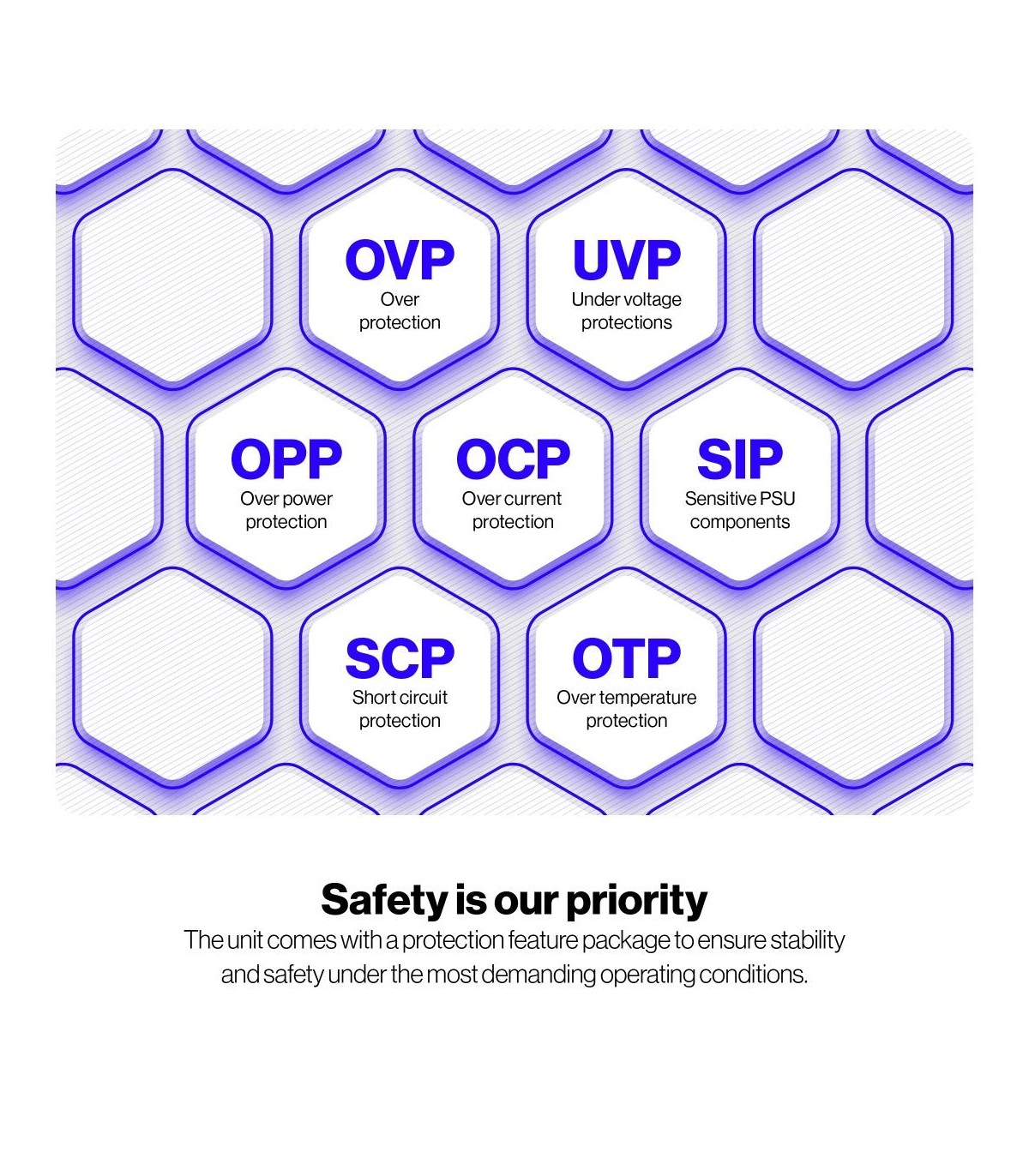 - Over current/Over power/Over voltage/Short circuit/Surge & inrush protection (SIP)/Under temperature/Under voltage