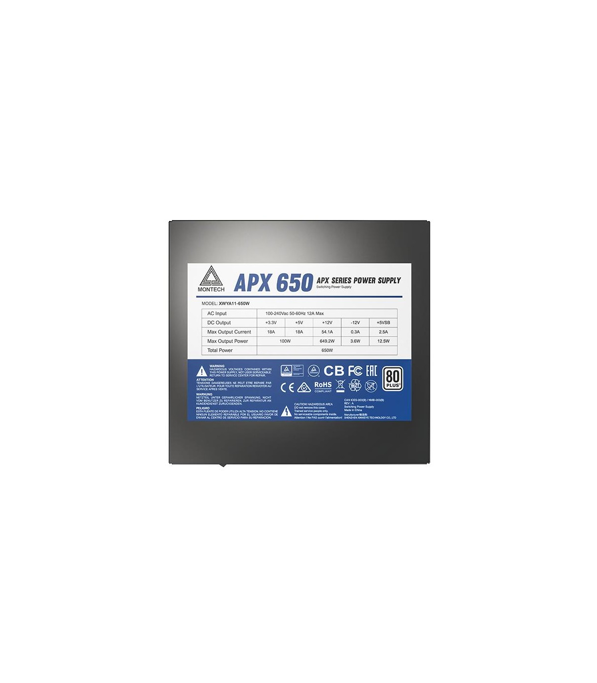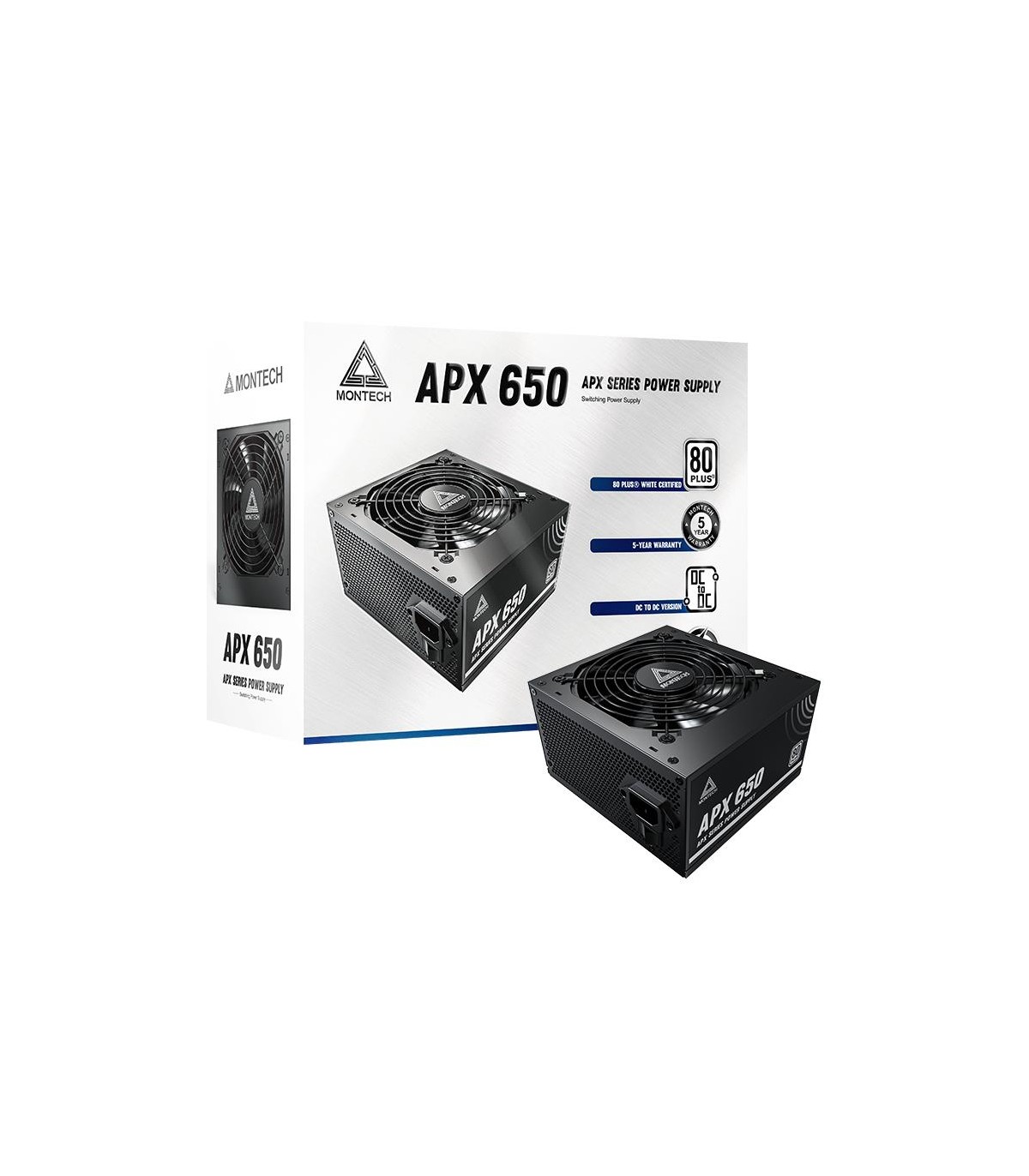 - Montech APX650. Total power: 650 W, AC input voltage: 100 - 240 V, AC input frequency: 50/60 Hz. Motherboard power connector: 20+4 pin ATX. Purpose: PC, Power supply unit (PSU) form factor: ATX, 80 PLUS certification: 80 PLUS White. Product colour: Black,