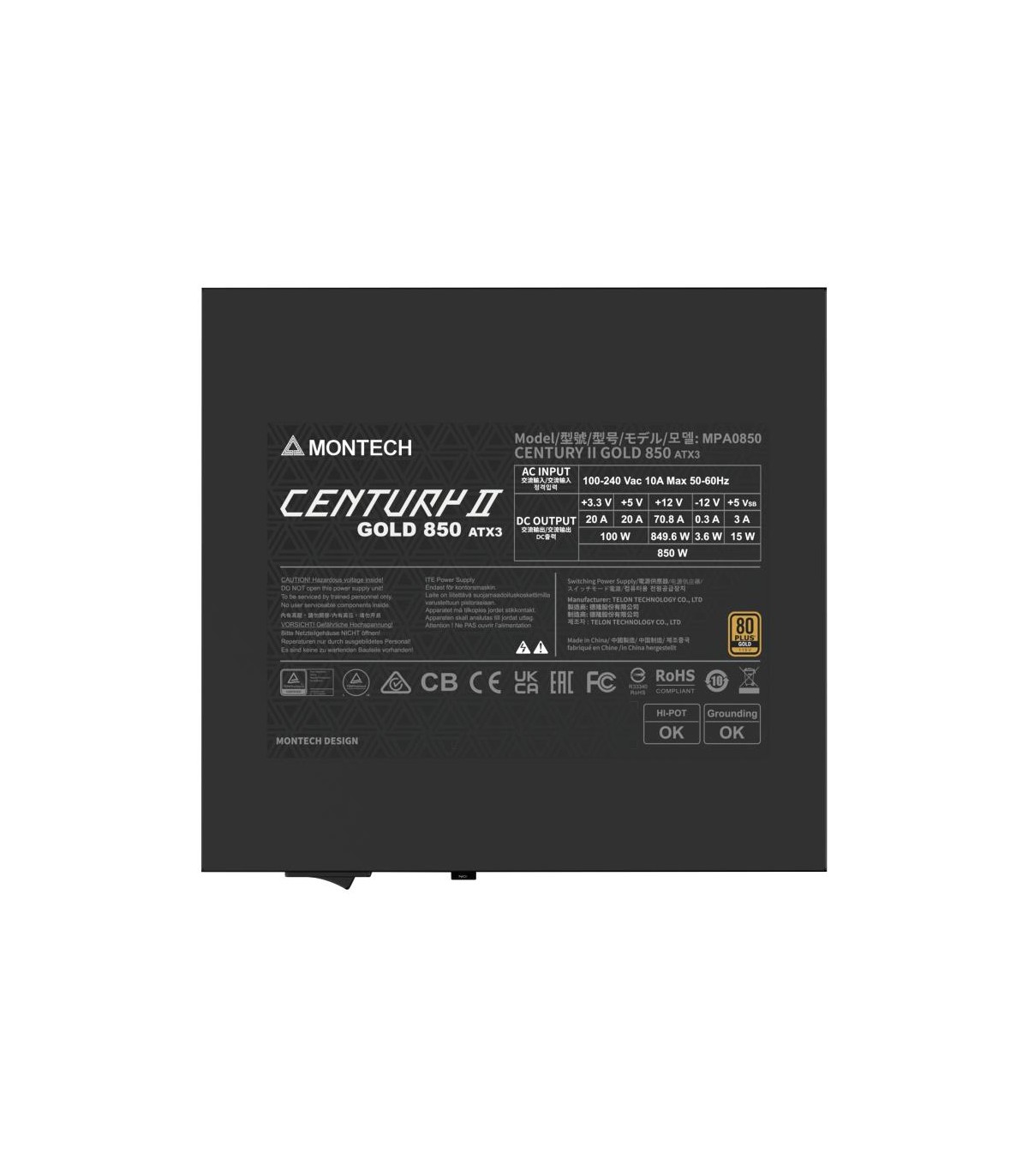 - Montech CENTURY II. Total power: 850 W, AC input voltage: 100 - 240 V, AC input frequency: 50/60 Hz. Motherboard power connector: 20+4 pin ATX, Motherboard power cable length: 60 cm, SATA power cable length: 950 mm. Purpose: PC, Power supply unit (PSU) fo