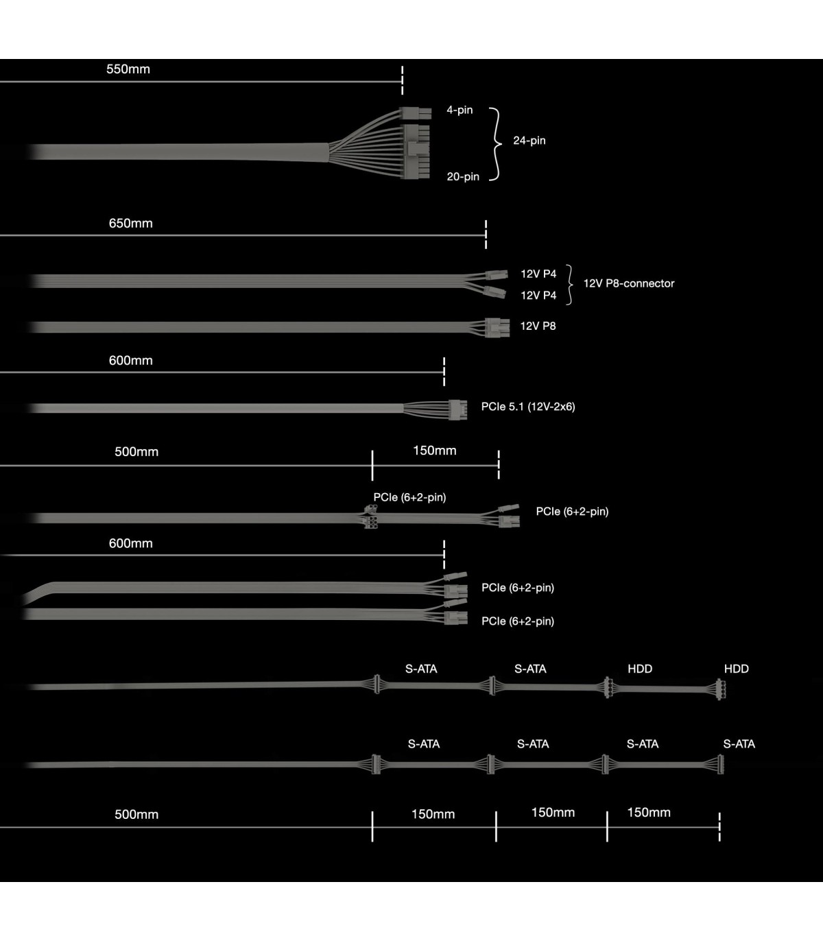 - AC,CPU,PCIe,Peripheral (Molex),SATA