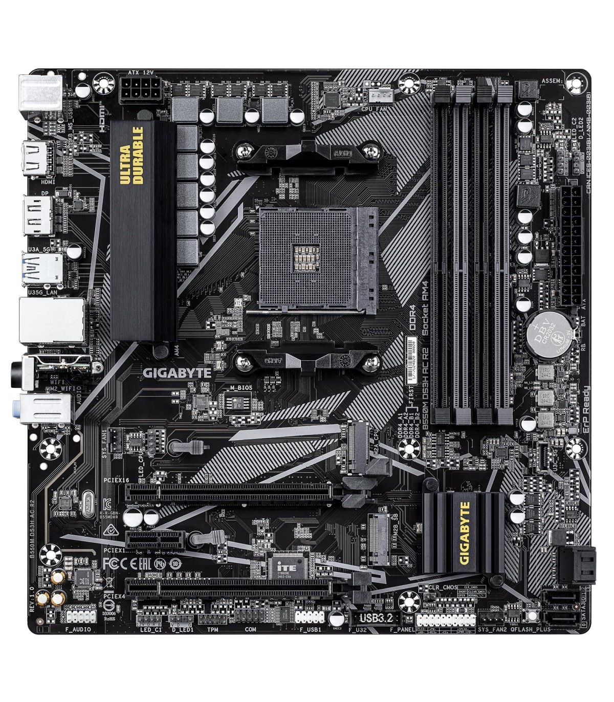- GIGABYTE B550M DS3H AC R2 Motherboard - AMD Ryzen 5000 CPUs, 5+3 Phases VRM, up to 4733MHz DDR4 (O.C.), 1xPCIe 4.0 + 1xPCIe 3.0 M.2, Wi-Fi 5, 1GbE LAN, USB 3.2 Gen 1. Processor manufacturer: AMD, Processor socket: Socket AM4, Compatible processor series: