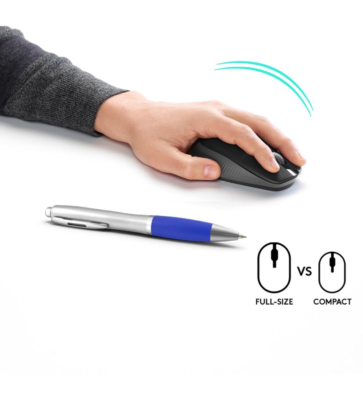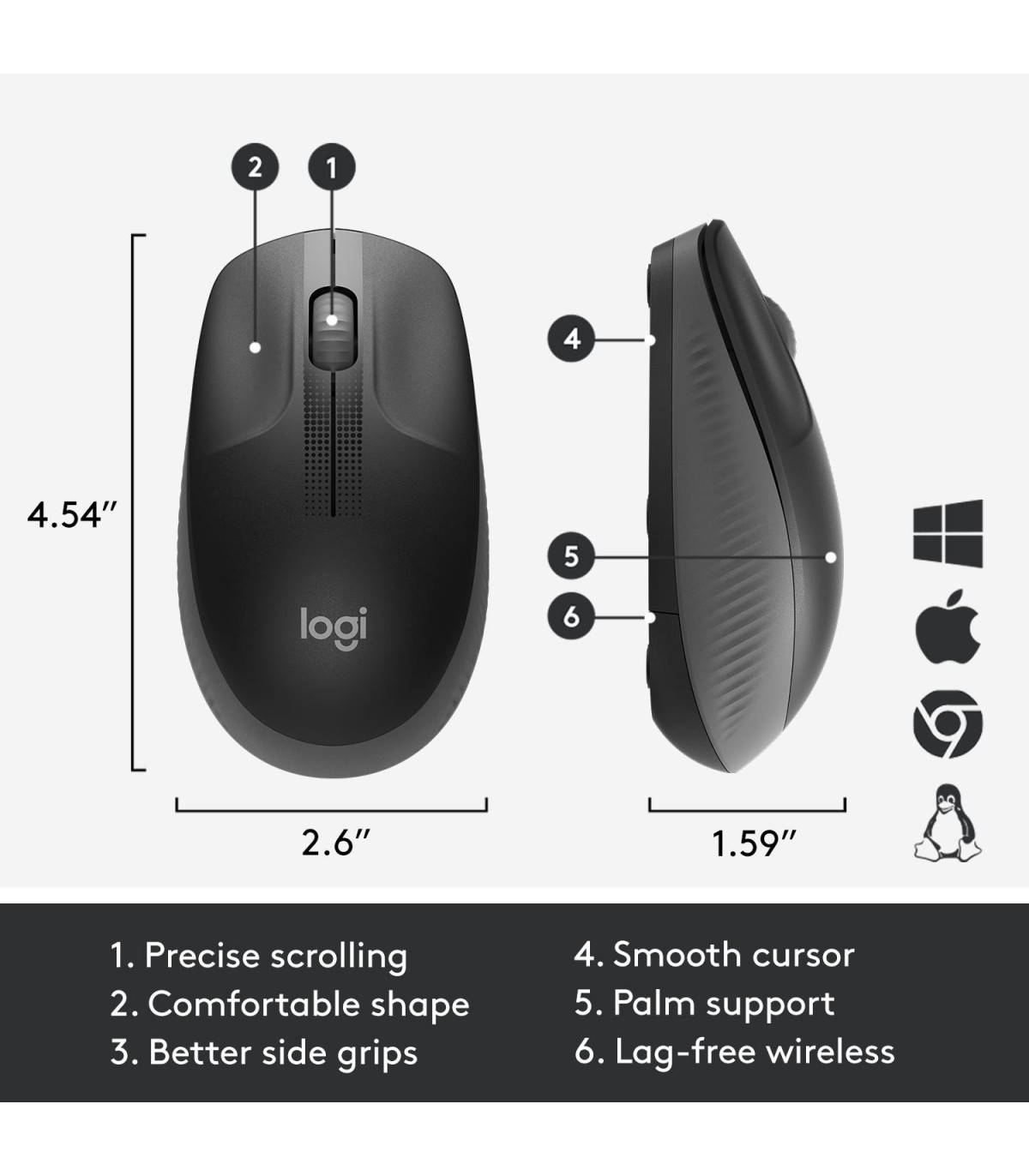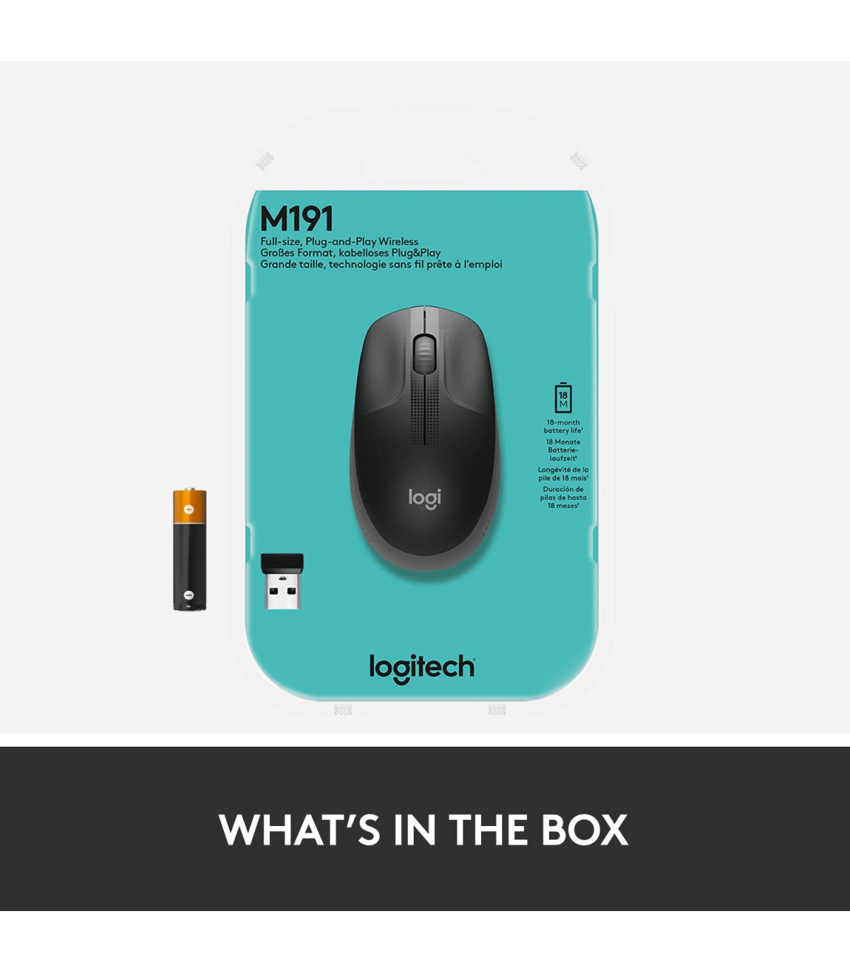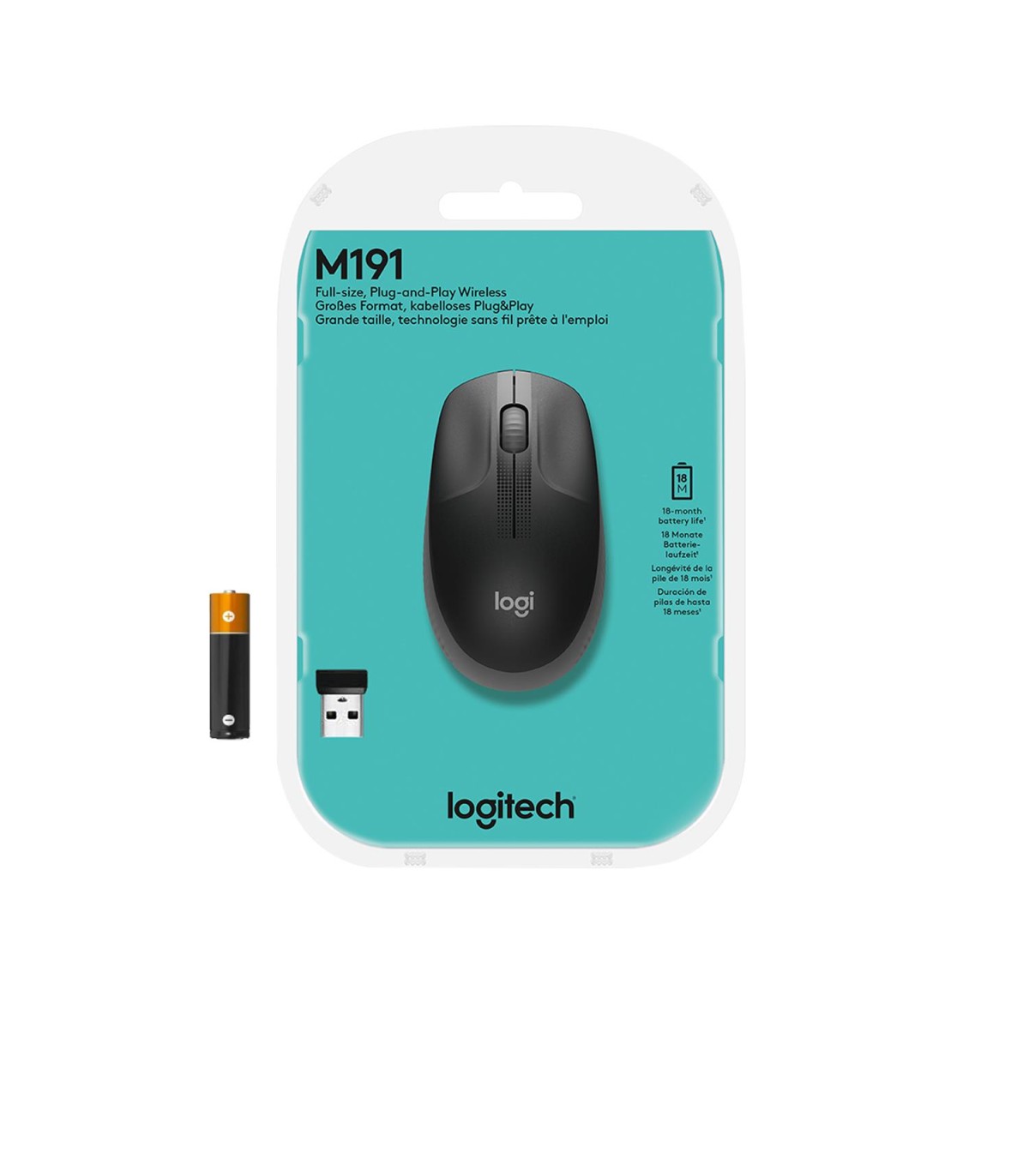 - Logitech M190 Full-size wireless mouse. Form factor: Ambidextrous. Movement detection technology: Optical, Device interface: RF Wireless, Movement resolution: 1000 DPI, Buttons type: Pressed buttons, Buttons quantity: 3, Scroll type: Wheel. Power source:
