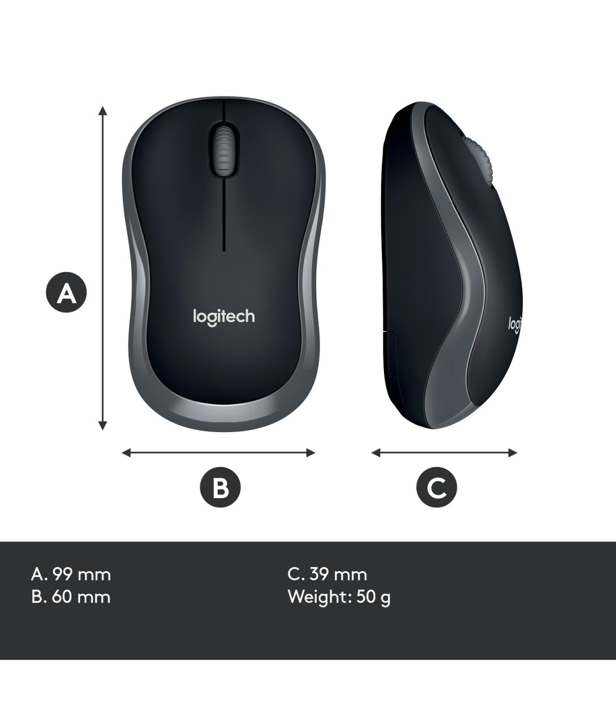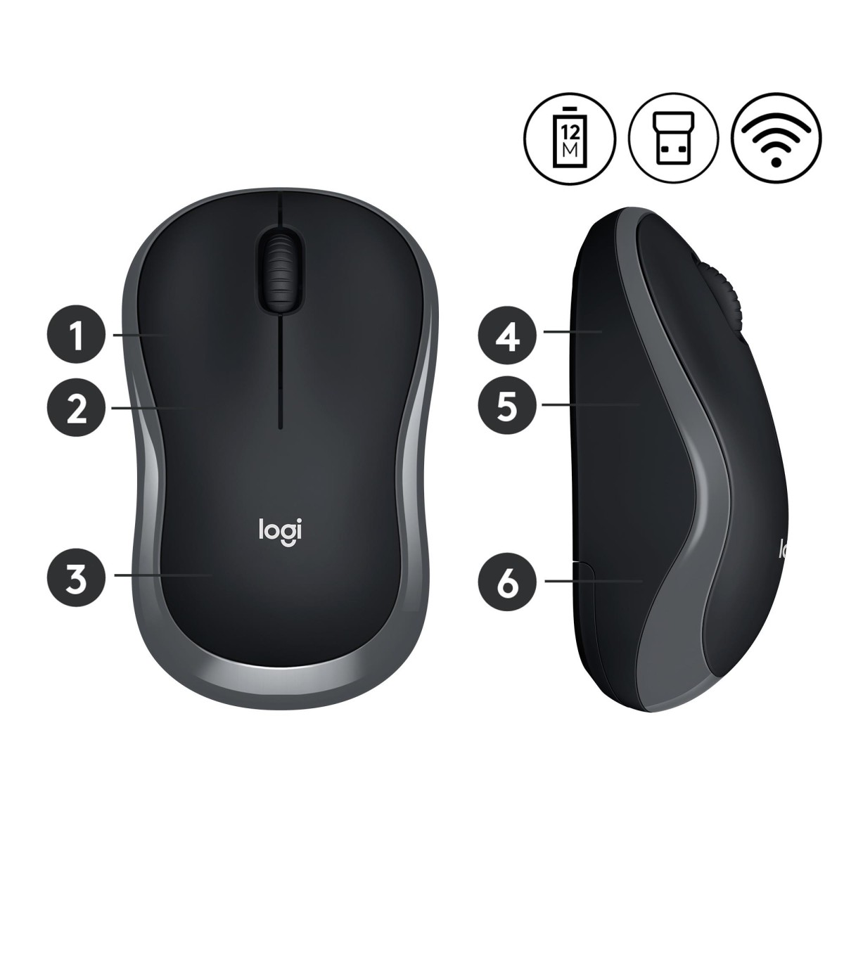 - Logitech Wireless Mouse M185. Form factor: Ambidextrous. Movement detection technology: Optical, Device interface: RF Wireless, Movement resolution: 1000 DPI, Buttons type: Pressed buttons, Buttons quantity: 2, Scroll type: Wheel. Power source: Batteries.