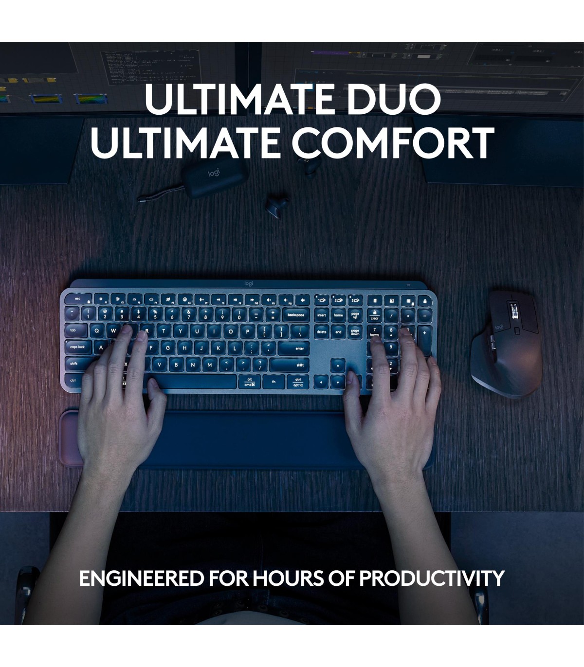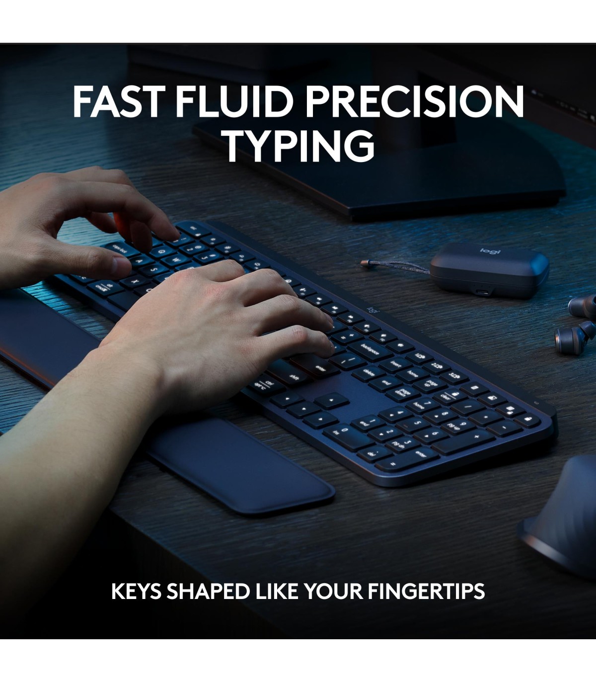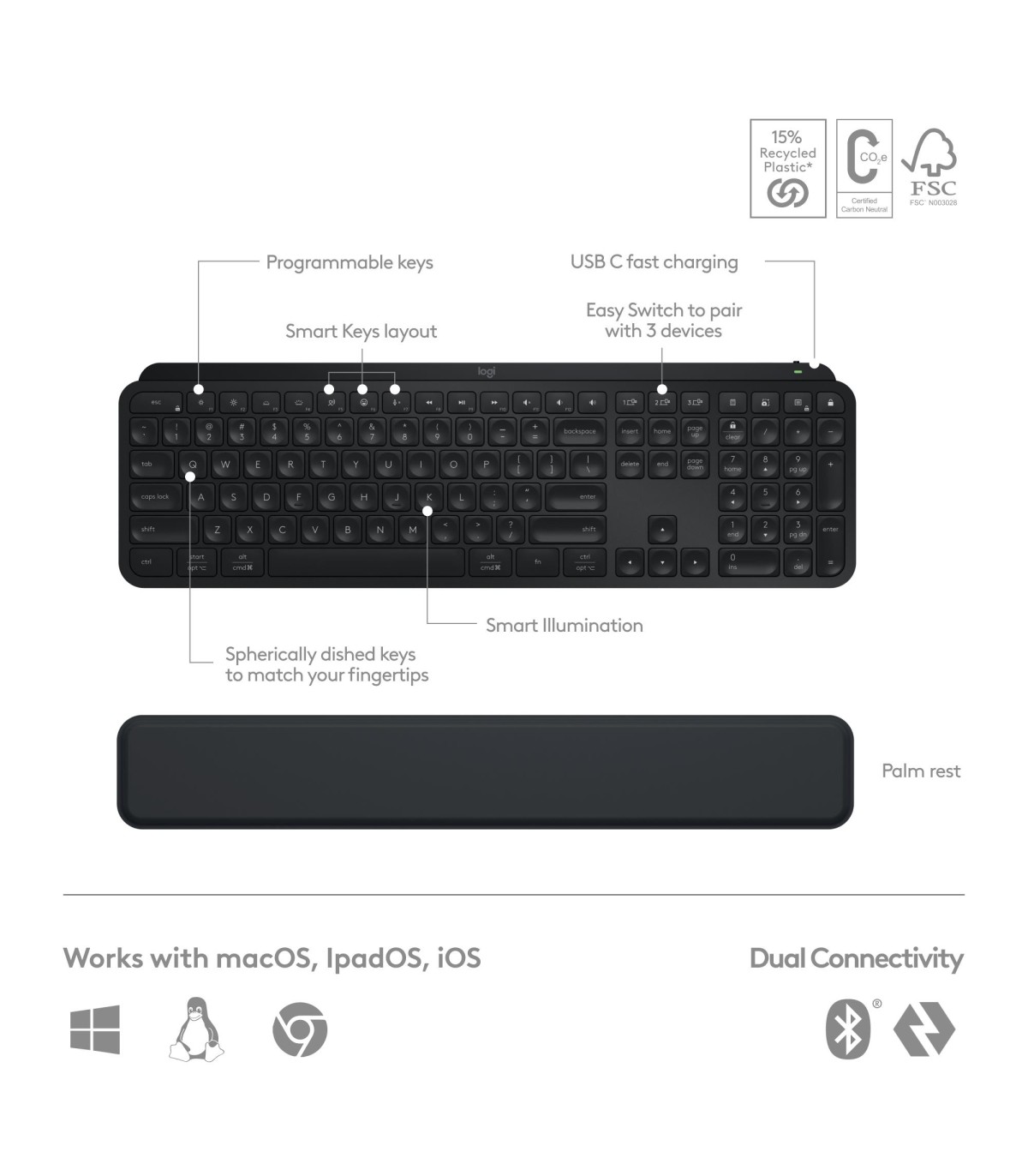 - Logitech Master MX Keys S Combo. Keyboard form factor: Full-size (100%). Keyboard style: Straight. Connectivity technology: Wireless, Device interface: Bluetooth, Keyboard key switch: Scissor key switch, Keyboard layout: QWERTY. Backlight type: LED, Wrist