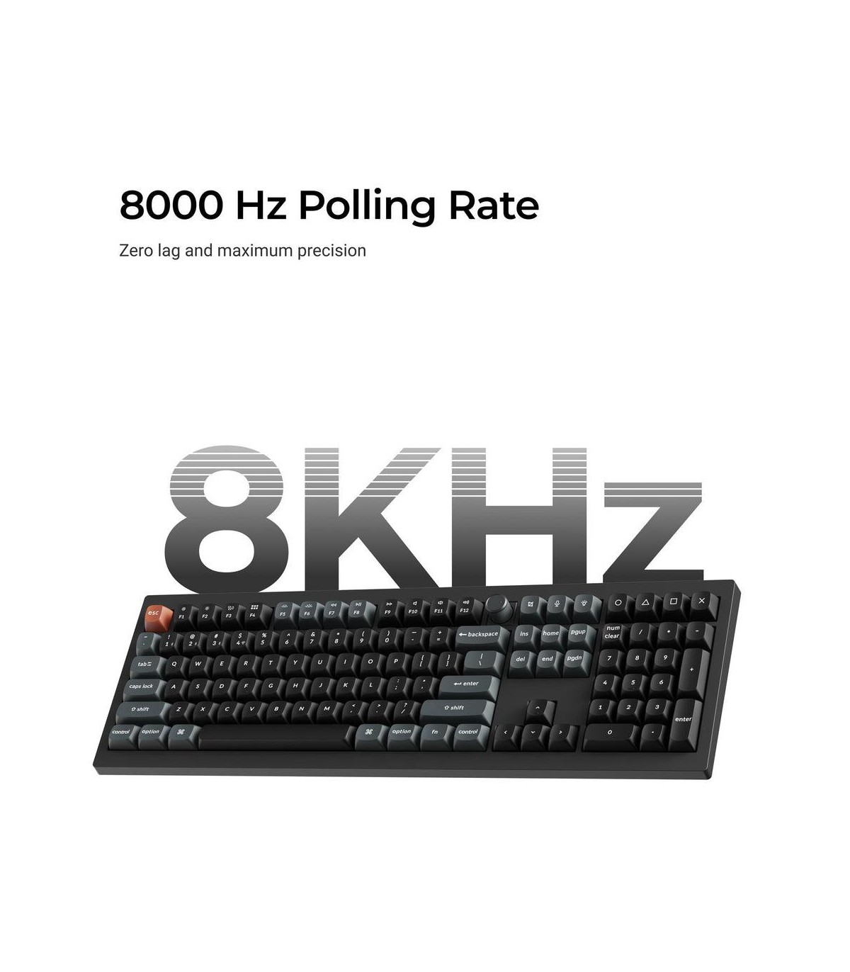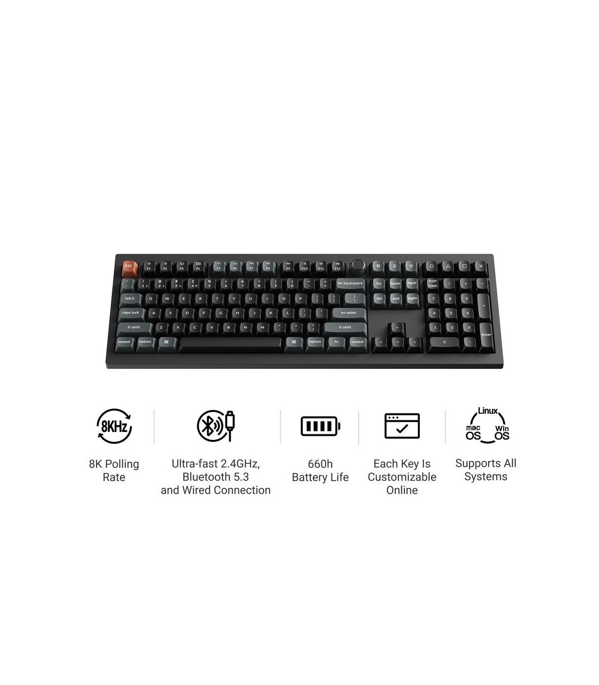 - Keychron V6 Ultra 8K. Keyboard form factor: Full-size (100%). Keyboard style: Straight. Connectivity technology: Wired & Wireless, Device interface: Bluetooth, Keyboard key switch: Mechanical, Keyboard layout: QWERTY. Backlight type: RGB LED. Recommended