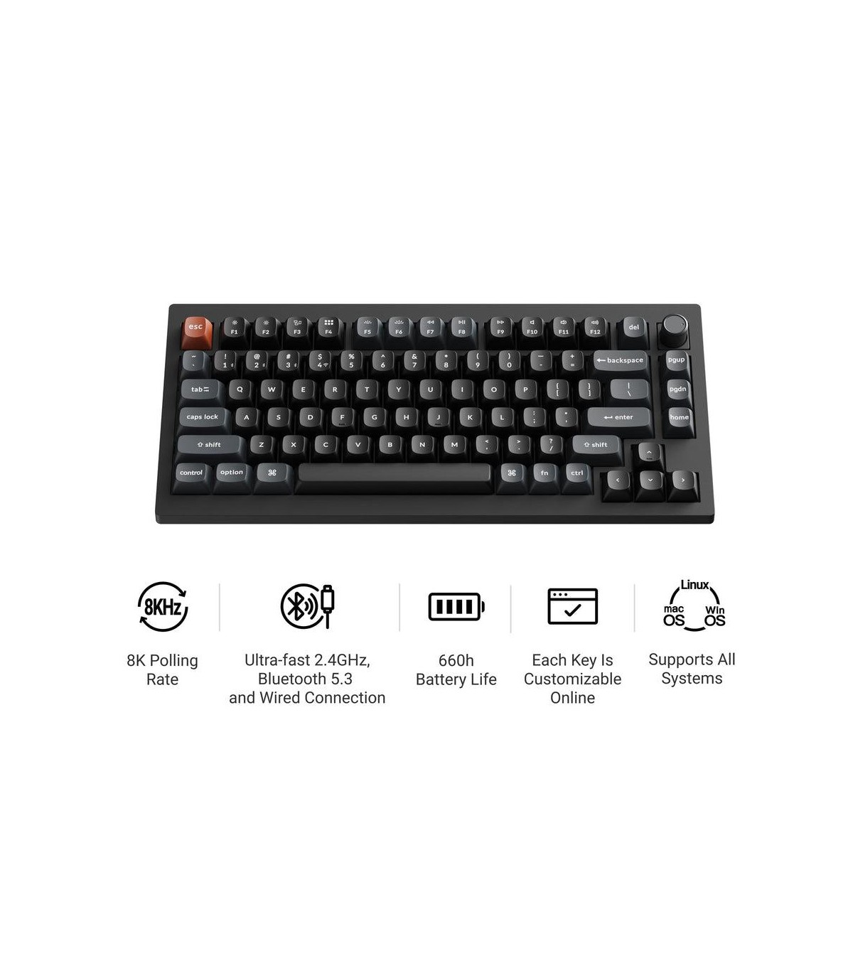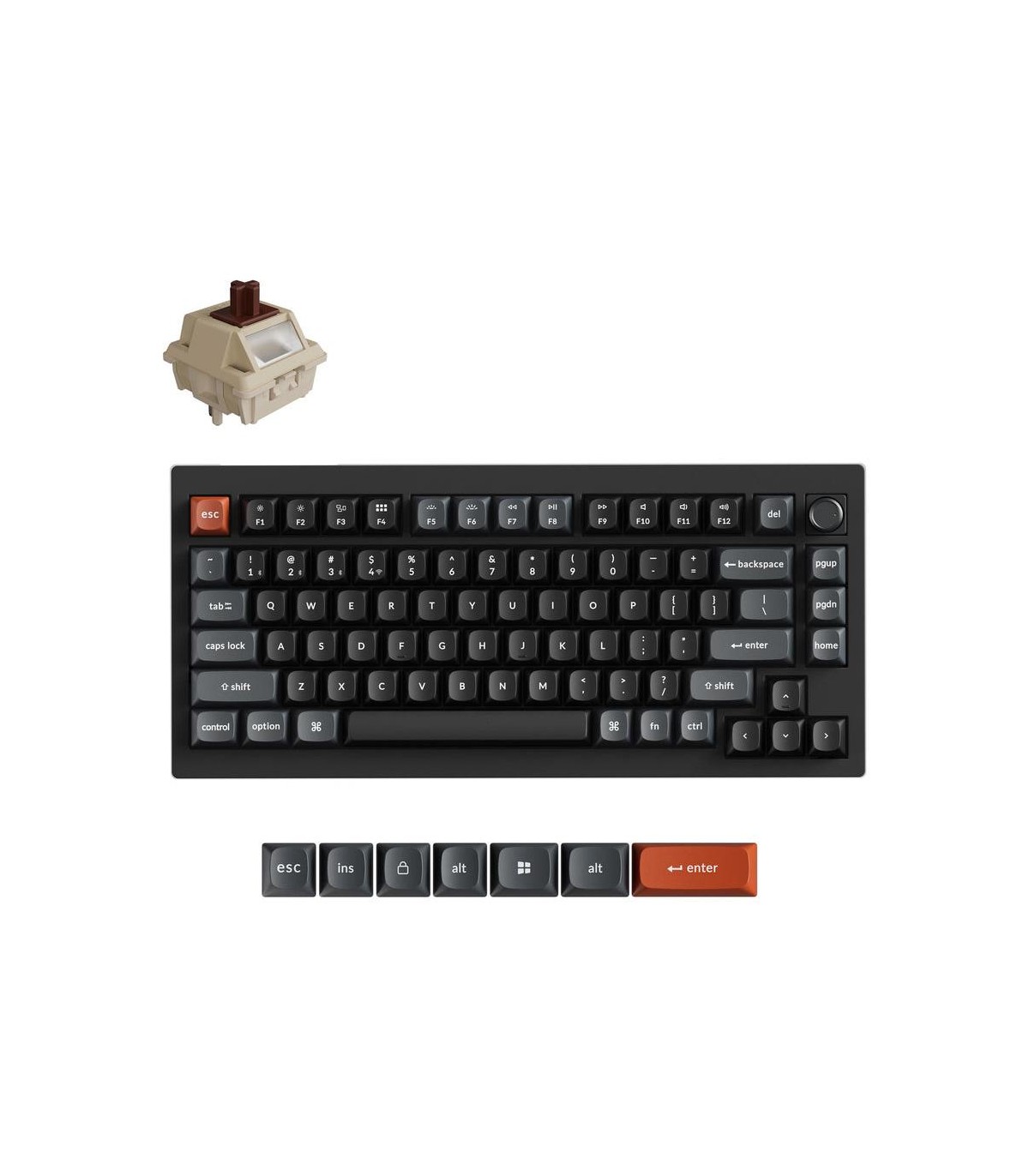 - Keychron V1 Ultra 8K. Keyboard form factor: 75%. Keyboard style: Straight. Connectivity technology: Wired & Wireless, Device interface: Bluetooth, Keyboard key switch: Mechanical, Keyboard layout: QWERTY. Backlight type: RGB LED. Recommended usage: Univer