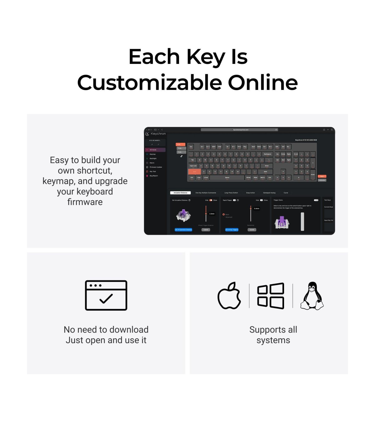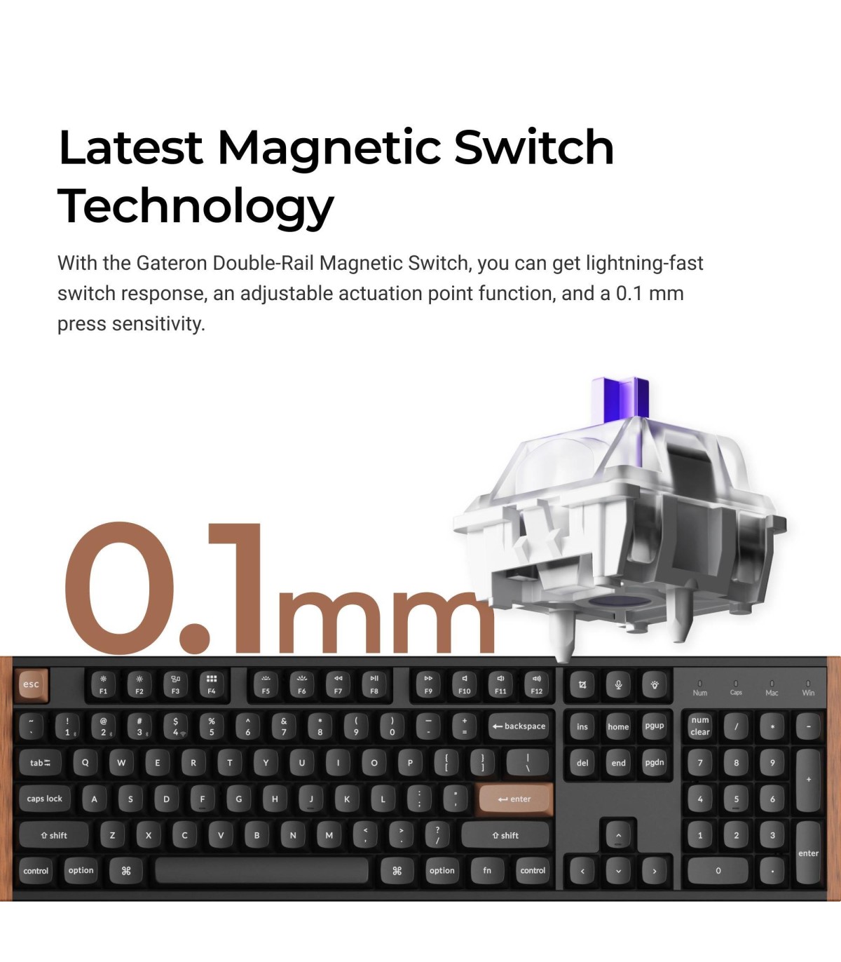 - Keychron K10 HE. Keyboard form factor: Full-size (100%), Connectivity technology: Wired & Wireless, Device interface: USB + RF Wireless + Bluetooth, Keyboard key switch: Magnetic-mechanical key switch, Keyboard layout: QWERTY. Backlight type: RGB LED. Rec