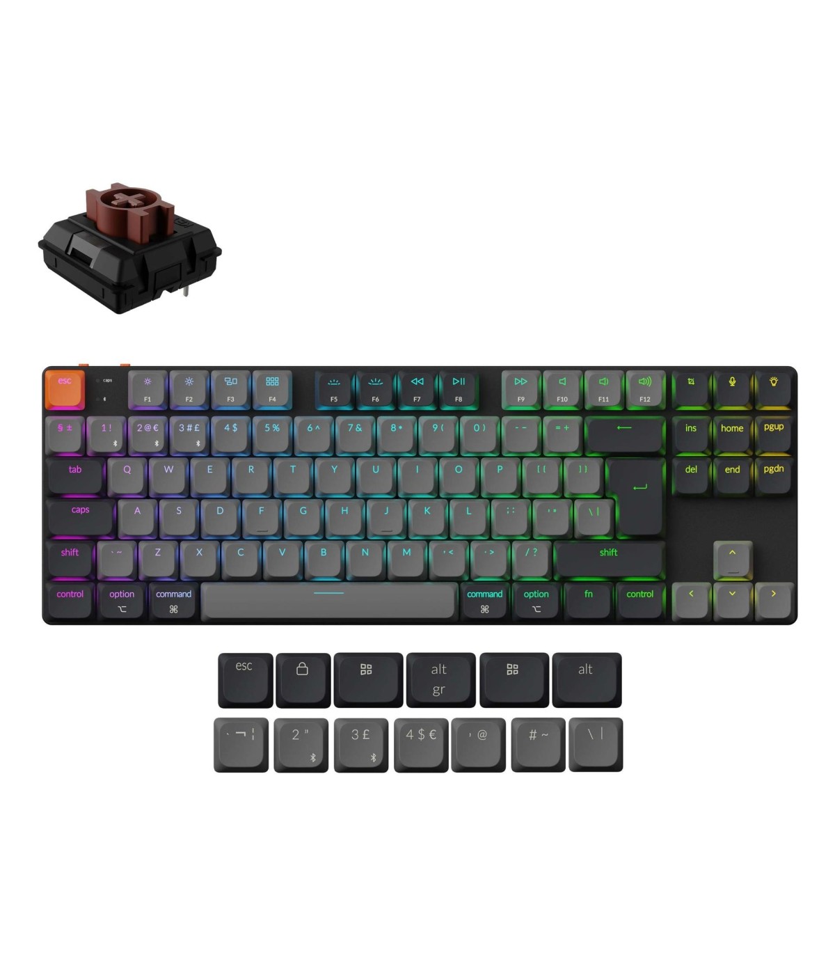 - Keychron K1. Keyboard form factor: 80%. Keyboard style: Straight. Connectivity technology: Wired & Wireless, Device interface: USB + Bluetooth, Keyboard key switch: Mechanical, Keyboard layout: QWERTY, Keyboard number of keys: 87. Backlight type: LED. Rec