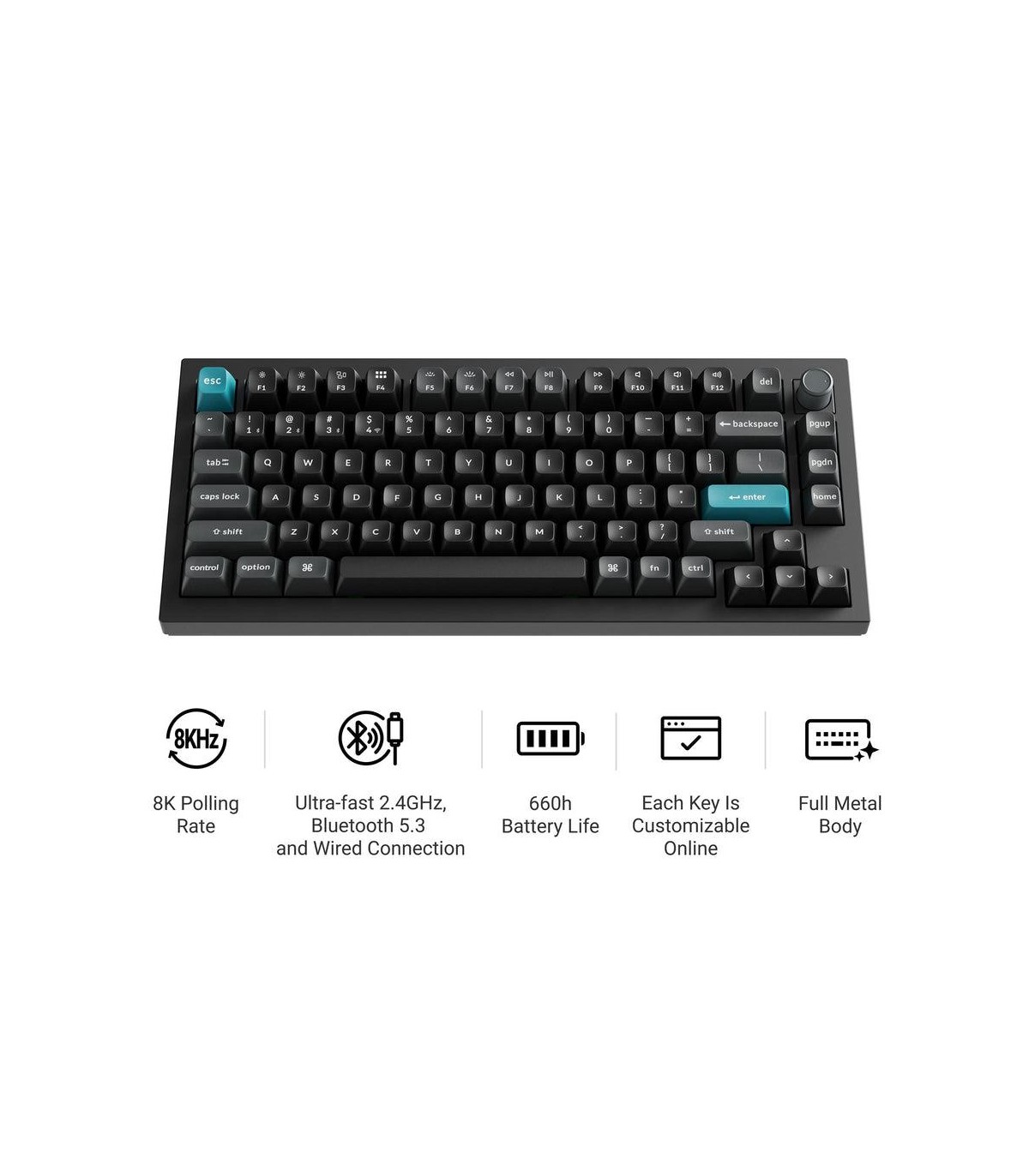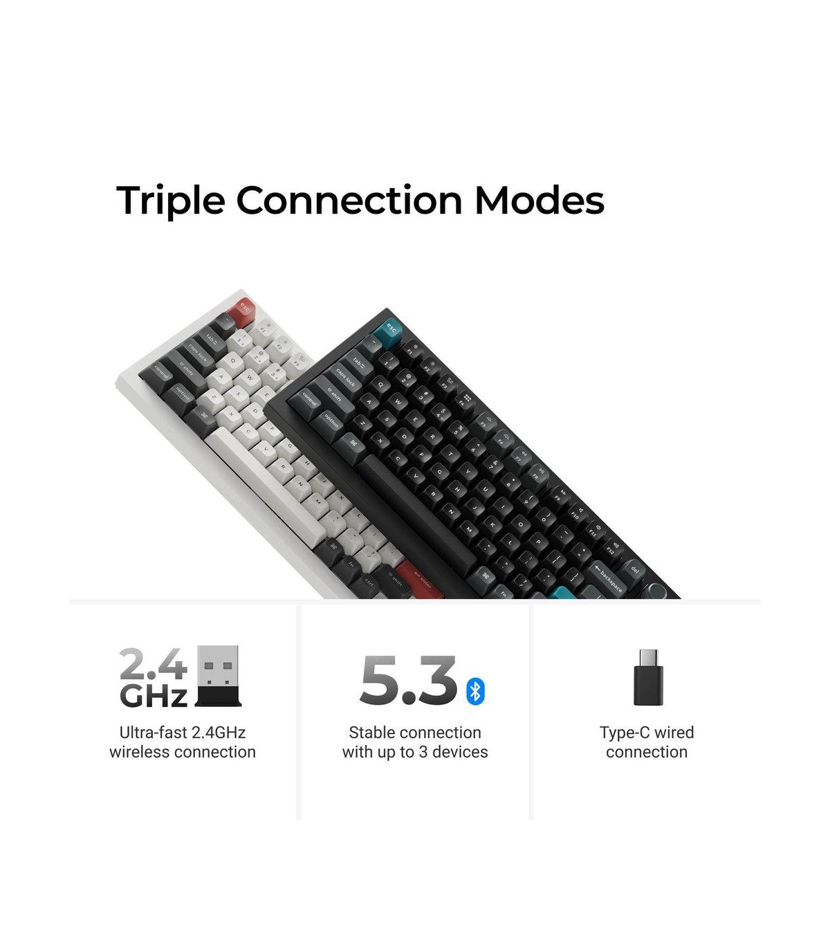 - Keychron Q1 Ultra 8K. Keyboard form factor: 75%. Keyboard style: Straight. Connectivity technology: Wired & Wireless, Device interface: USB + RF Wireless + Bluetooth, Keyboard key switch: Mechanical. Backlight type: RGB LED. Recommended usage: Gaming. Pro