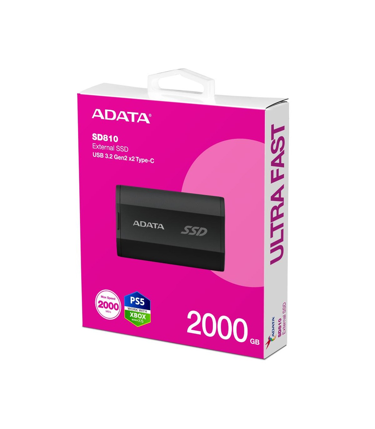 - ADATA SD810. SSD capacity: 2 TB. USB connector: USB Type-C, USB version: USB 3.2 Gen 2x2. Read speed: 2000 MB/s, Write speed: 2000 MB/s. Product colour: Black