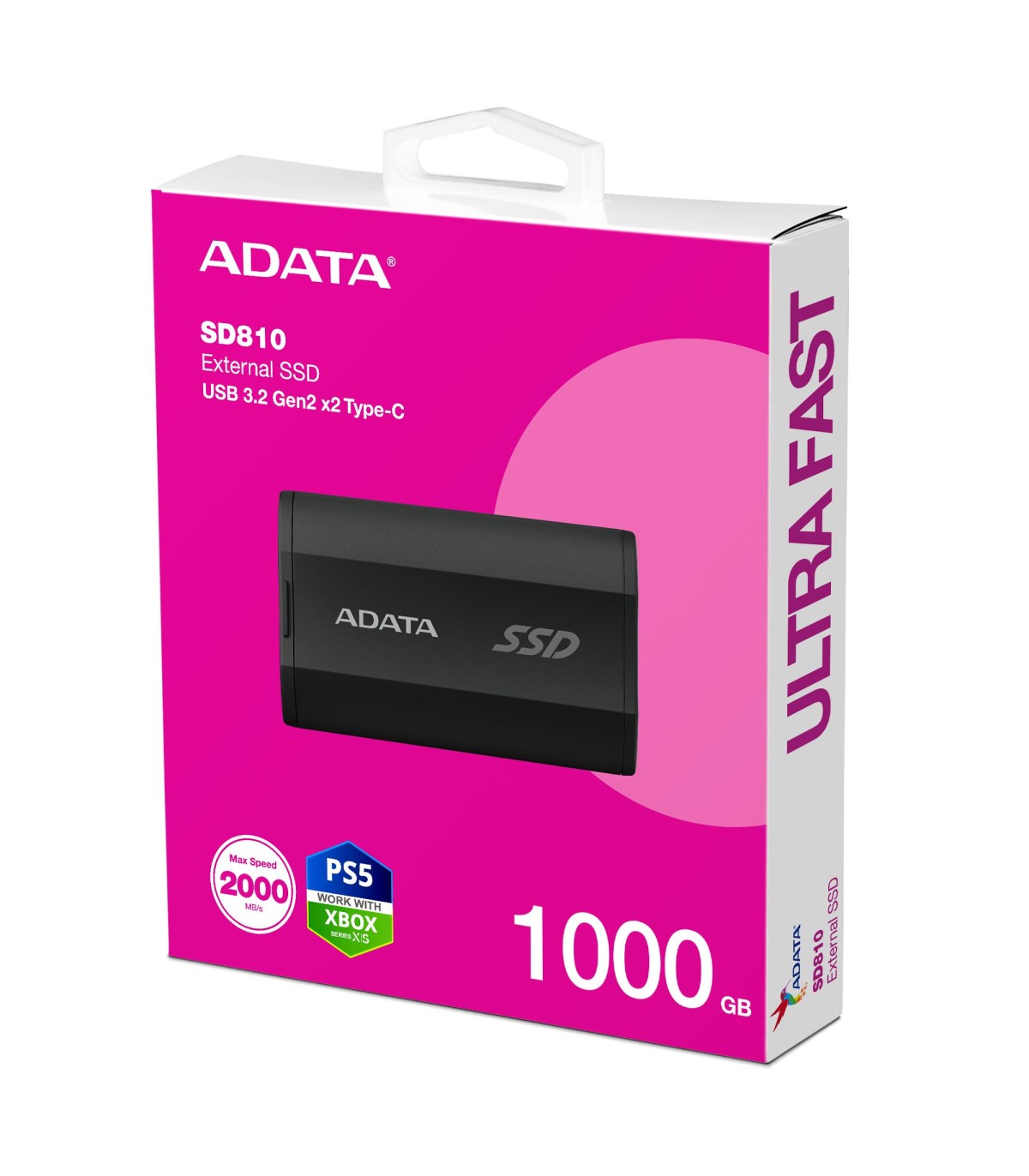 - ADATA SD810. SSD capacity: 1 TB. USB connector: USB Type-C, USB version: USB 3.2 Gen 2x2. Read speed: 2000 MB/s, Write speed: 2000 MB/s. Product colour: Black