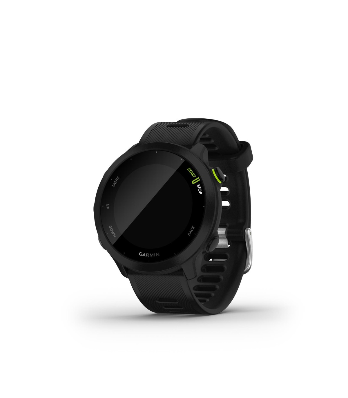 - Garmin Forerunner 55. Display diagonal: 2.64 cm (1.04"), Display resolution: 208 x 208 pixels. GPS (satellite). Weight: 37 g. Band material: Silicone, Band colour: Black