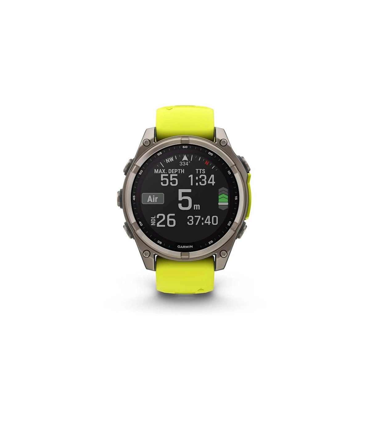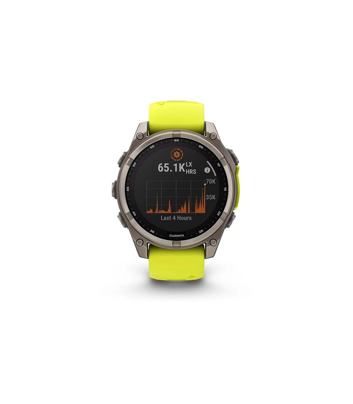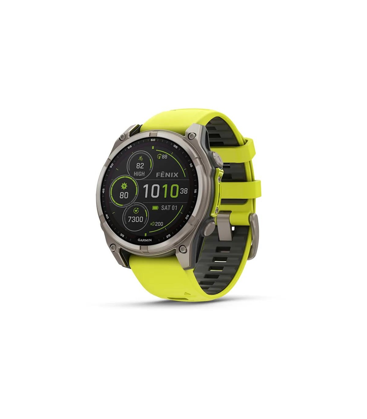 - Garmin fenix 8. Display diagonal: 3.3 cm (1.3"), Display resolution: 260 x 260 pixels, Touchscreen. Flash memory: 32 GB. Wi-Fi. GPS (satellite). Weight: 80 g. Waterproof up to: 40 m, Band material: Silicone, Band colour: Graphite, Yellow, Band size: One S