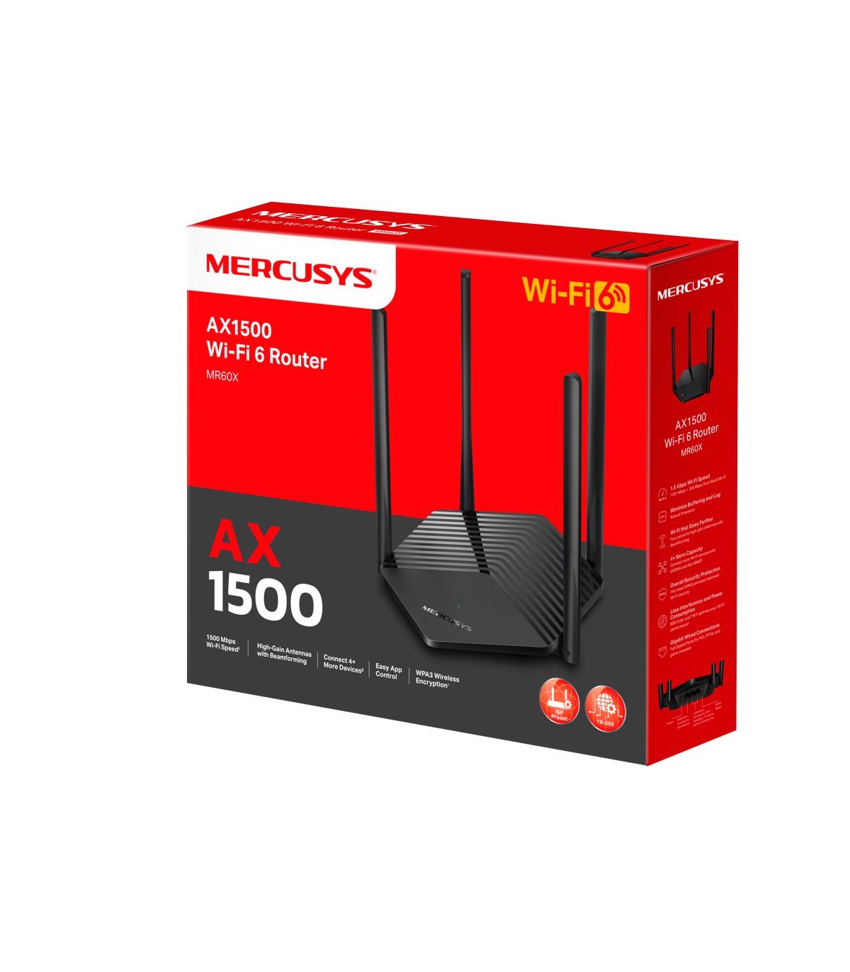 - Mercusys AX1800 Dual-Band WiFi 6 Router. WAN connection type: RJ-45. Wi-Fi band: Dual-band (2.4 GHz / 5 GHz), Top Wi-Fi standard: Wi-Fi 6 (802.11ax), WLAN data transfer rate (max): 1500 Mbit/s. Ethernet LAN interface type: Gigabit Ethernet, Ethernet LAN d