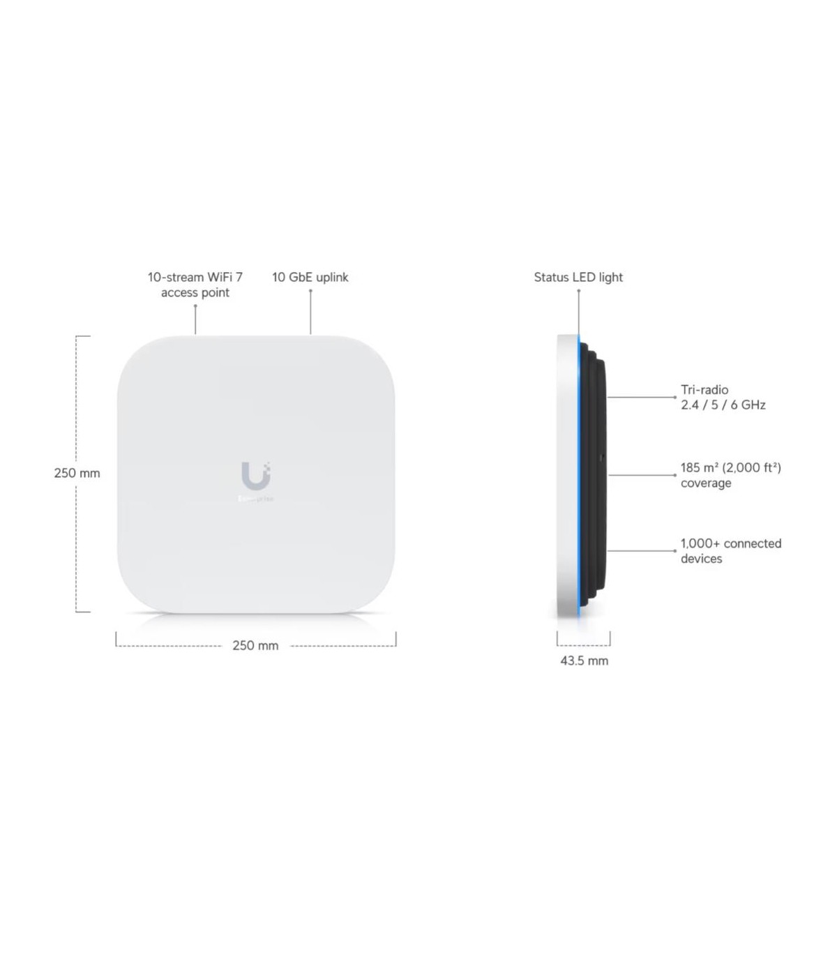 - Ubiquiti E7. 2.4 GHz, 5 GHz, 6 GHz, Maximum data transfer rate: 11500 Mbit/s. Security algorithms: PPSK. Ethernet LAN data rates: 10,100,1000,10000 Mbit/s. Power over Ethernet (PoE). Product colour: White